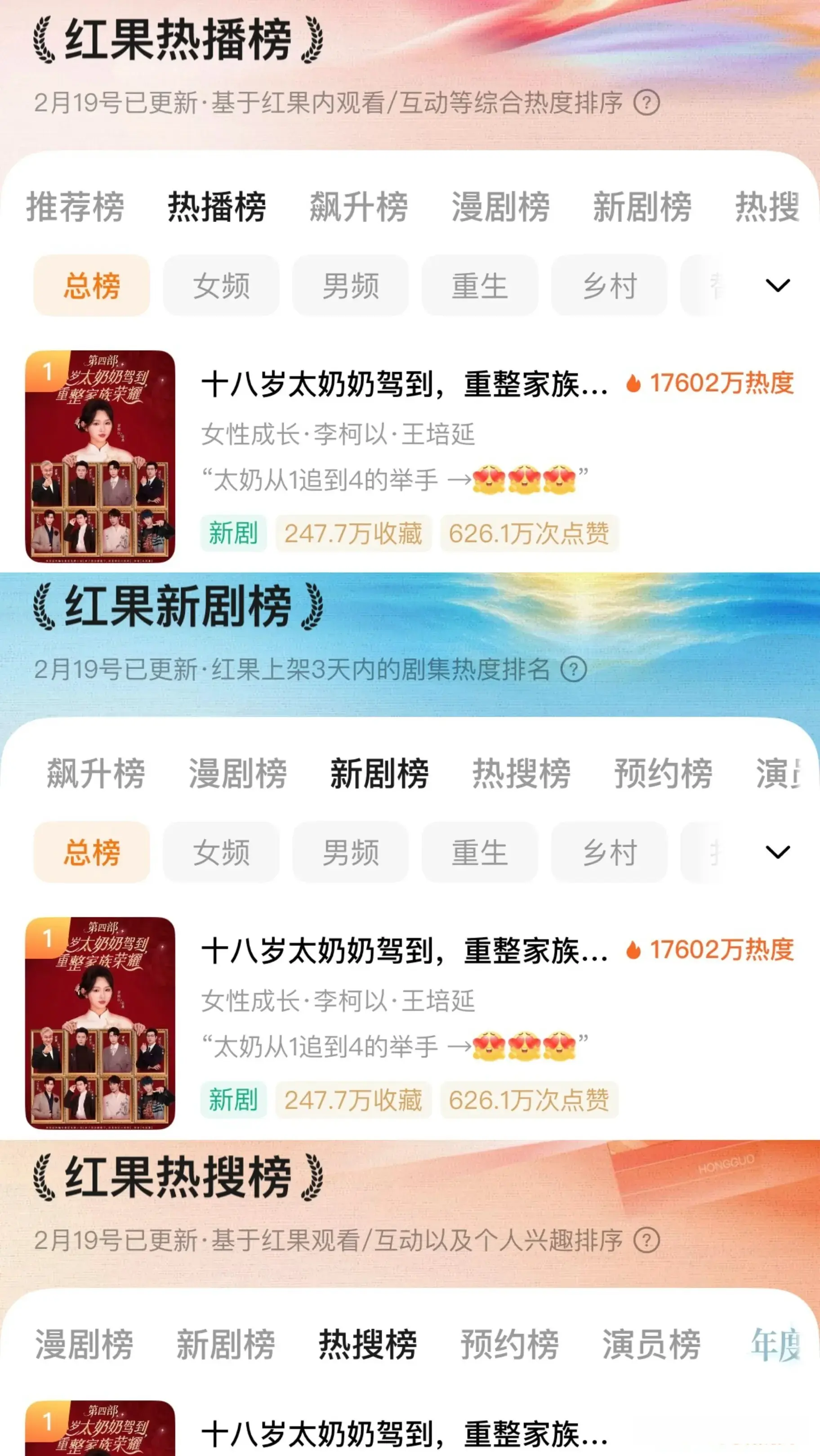 红果昨天一早弹出推送,手速快的已经刷完前两集——《十八岁太奶奶驾到:重整家族荣耀第四部》真上线了。不是预告,不是定档,是实打实的正片,连片头都没剪完就热了。24小时,17602万热度,三个榜(热播、新剧、热搜)第一全拿下,比去年春节档某顶流剧开播首日还高出三千多万。你刷到那条“纪斯年转世成盛清衍,结果被自家老爷子按着骂‘臭小子离我孙媳妇远点’”的片段没?弹幕全在喊“纪家祖传恋爱脑+物理级误会狂魔”。